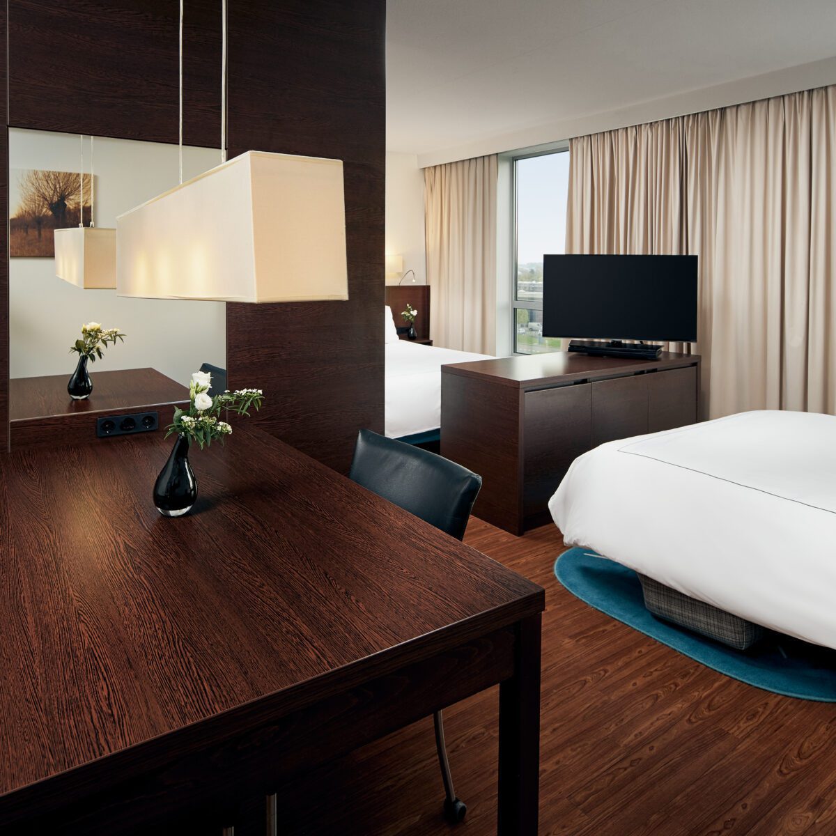 Our Executive Queen Room with a sofabed sleeps up to three adults or two adults and two children. Each room is equipped with modern amenities to ensure maximum comfort. Free access to the fitness centre is included, as is an in-room entertainment system, lounge area, bathroom with bathtub and shower, and a plush bathrobe and slippers.